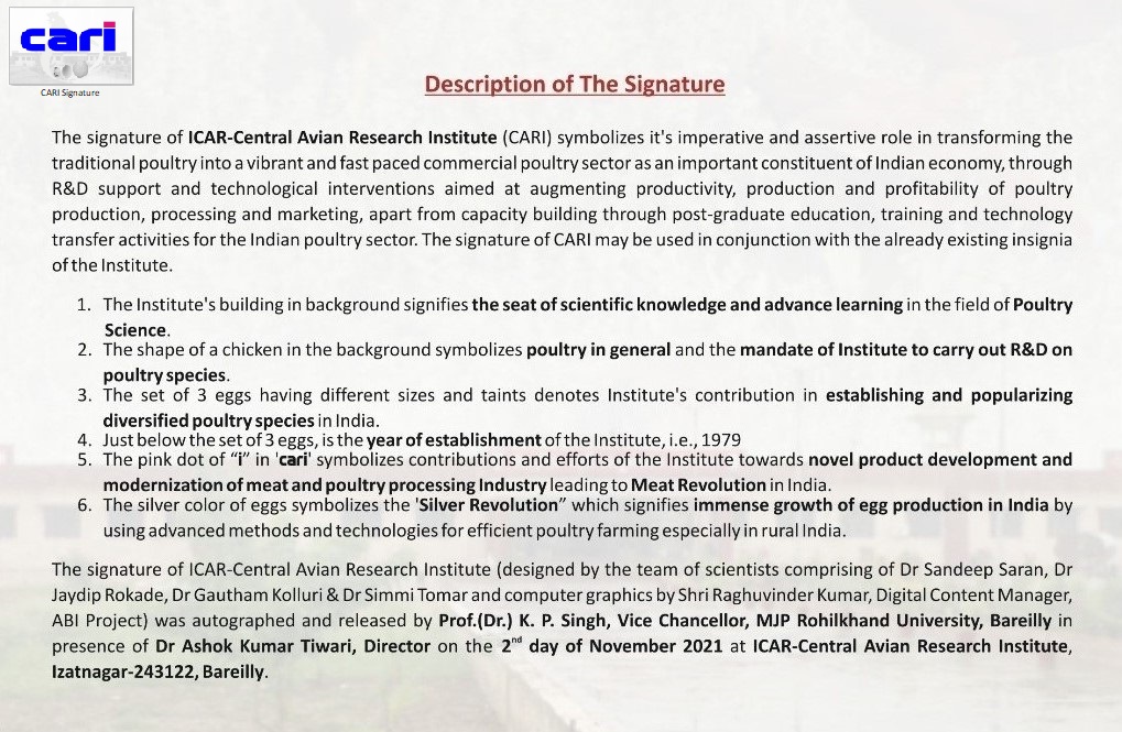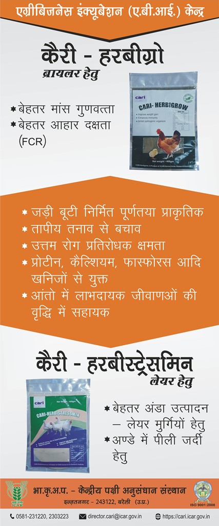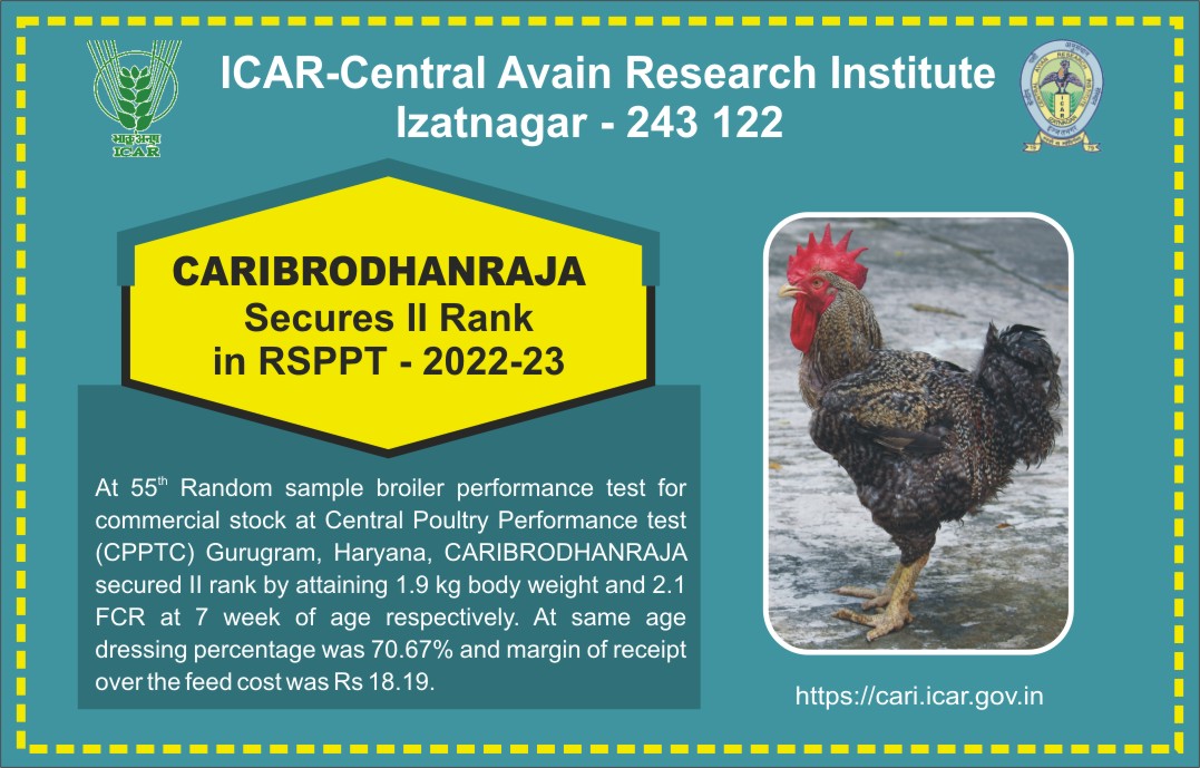 This is the official website of ICAR-Central Avian Research Institute (ICAR-CARI), Izatnagar, an institute under Indian Council of Agricultural Research (ICAR), Department of Agricultural Research and Education (DARE), Ministry of Agriculture and Farmers' Welfare, Government of India. Website developed and maintained by Nodal Officer AKMU: Dr Sandeep Saran and Digital Content Manager (ABI): Shri Raghuvinder Kumar CARI, Izatnagar.